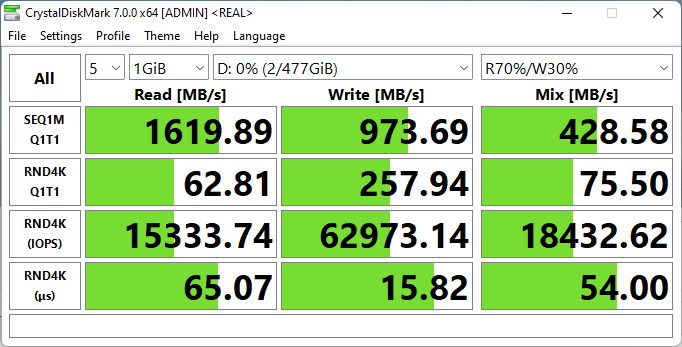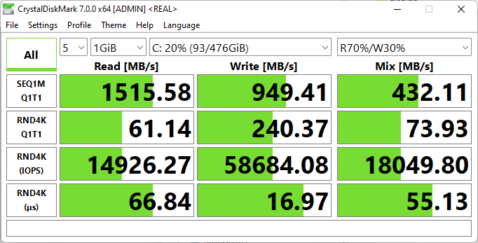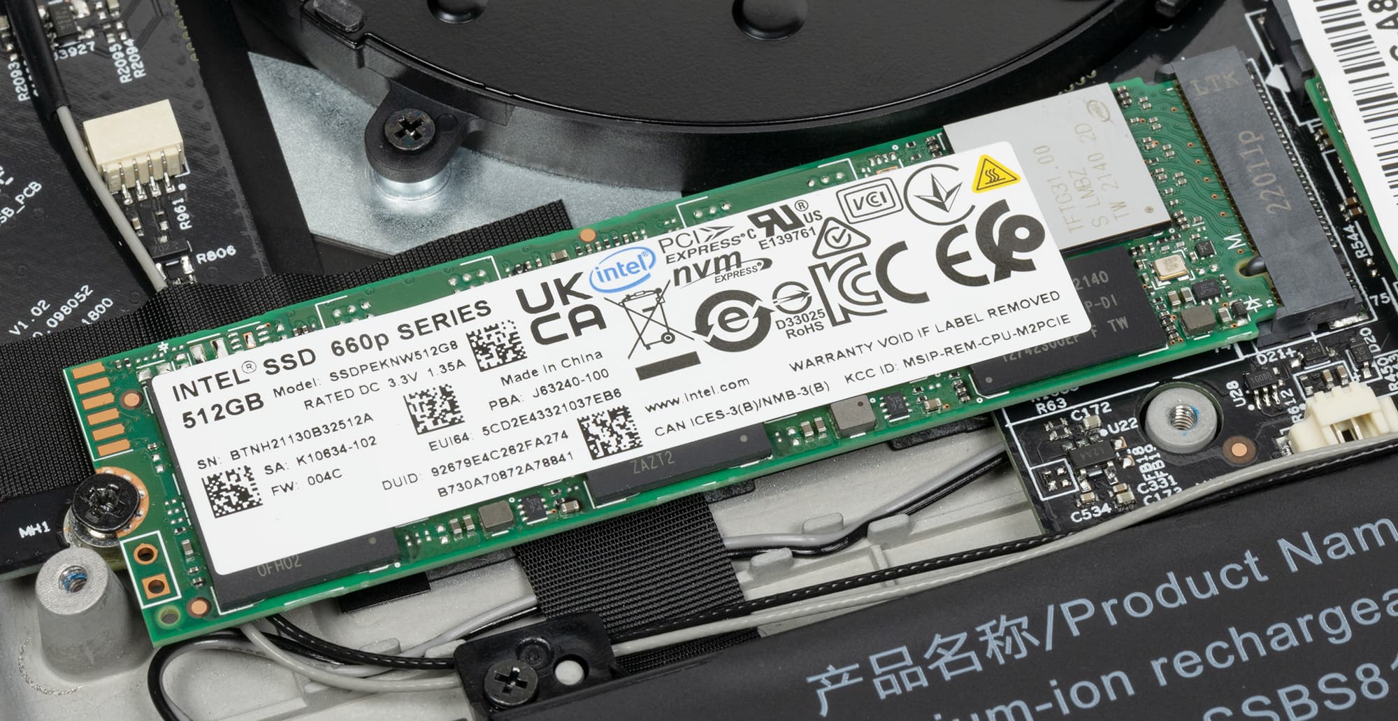 Как уже было сказано, используется не один SSD-накопитель на 1 ТБ, а два одинаковых Intel 660p емкостью по 512 ГБ с памятью QLC и интерфейсом PCIe 3.0 x4. Это не самая современная модель — она предлагается уже 4 года, причем даже на момент появления ни в коем случае не относилась к флагманским, а сегодня показанные результаты можно назвать лишь едва удовлетворительными (приводим скриншоты теста CDM для обоих накопителей, разница в полученных значениях находится во вполне объяснимых рамках):