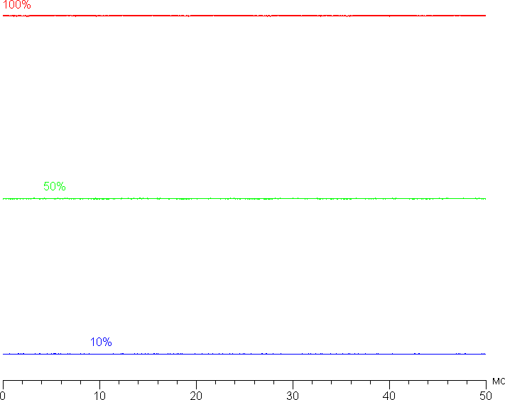 На любом уровне яркости значимая модуляция подсветки отсутствует, поэтому нет и никакого мерцания экрана (нет ШИМ). В доказательство приведем графики зависимости яркости (вертикальная ось) от времени (горизонтальная ось) при различных значениях настройки яркости: