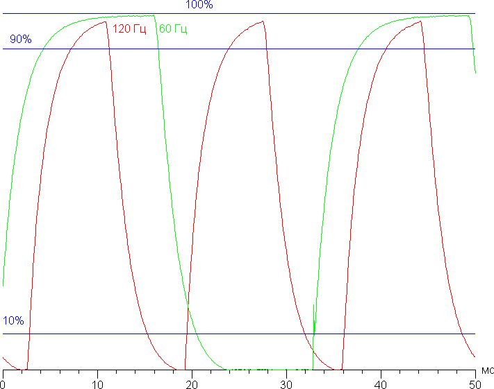 Посмотрим, хватит ли такой скорости матрицы для вывода изображения с частотой 120 Гц. Приведем зависимость яркости от времени при чередовании белого и черного кадра при 120 Гц кадровой частоты (и при 60 Гц для сравнения):
