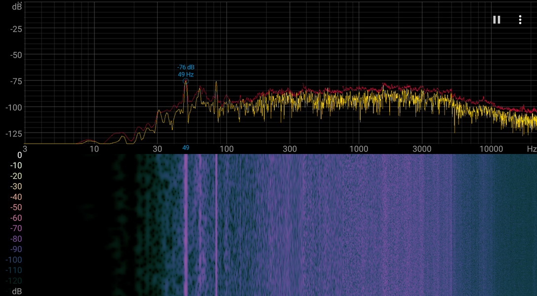 Спектрограмма, полученная для варианта с максимальной нагрузкой на процессор и видеокарту, достаточно ровная, и в диапазоне частот, где звуки могут вызывать особенное раздражение, выраженных пиков нет (низкочастотными пиками можно пренебречь):