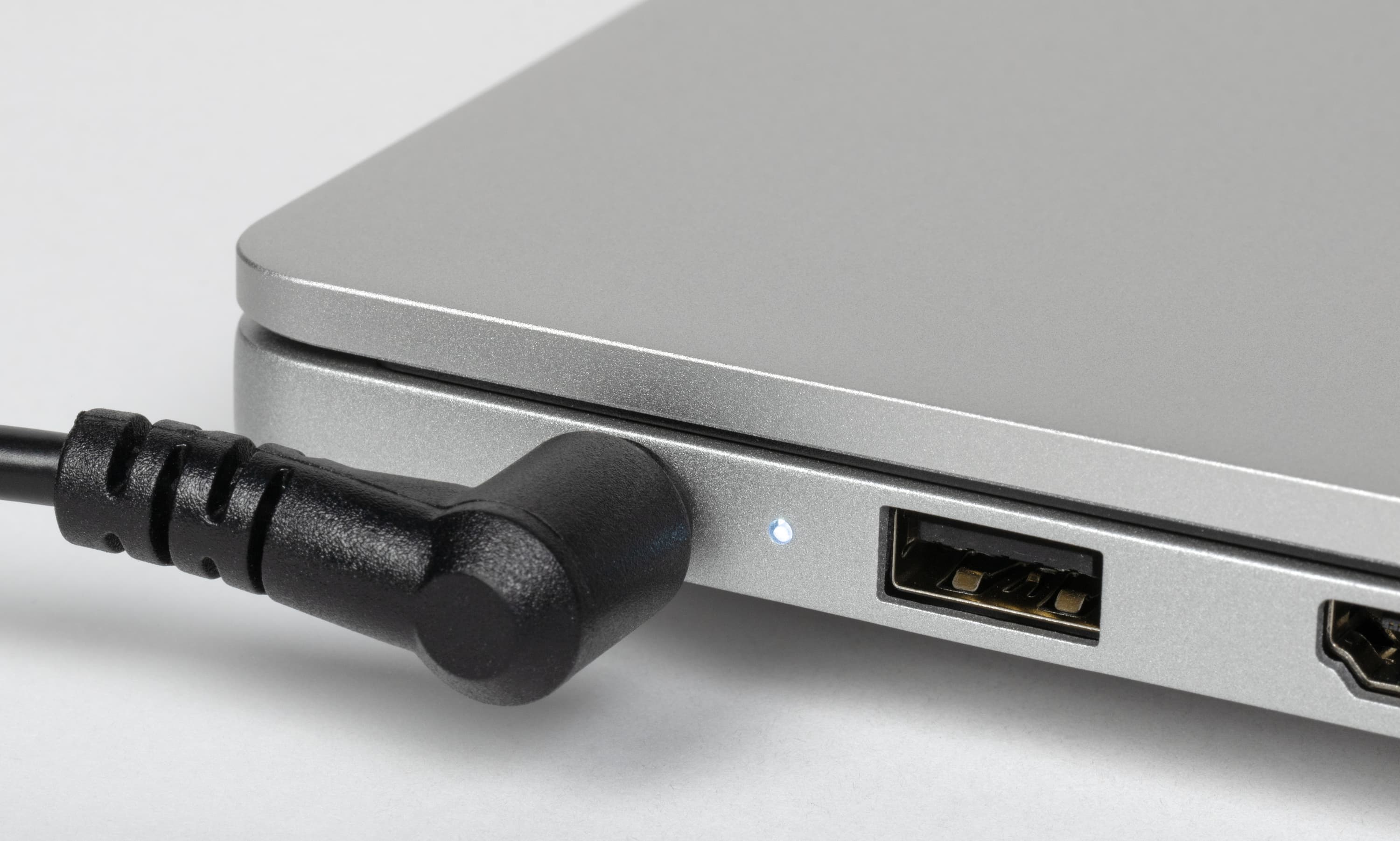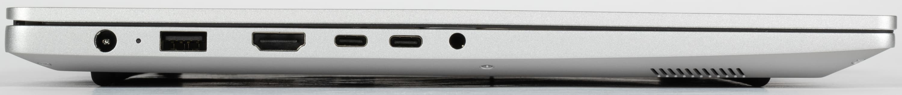 Слева помещаются коаксиальный разъем адаптера питания, светодиодный индикатор работы от сети, порт USB Type A, стандартный видеовыход HDMI, два порта USB Type-С и комбинированный аудиоджек для подключения гарнитуры. Оба Type-C поддерживают вывод видео по DisplayPort и питание внешних устройств (PowerDelivery). Для зарядки машины можно использовать любой из этих двух разъемов.