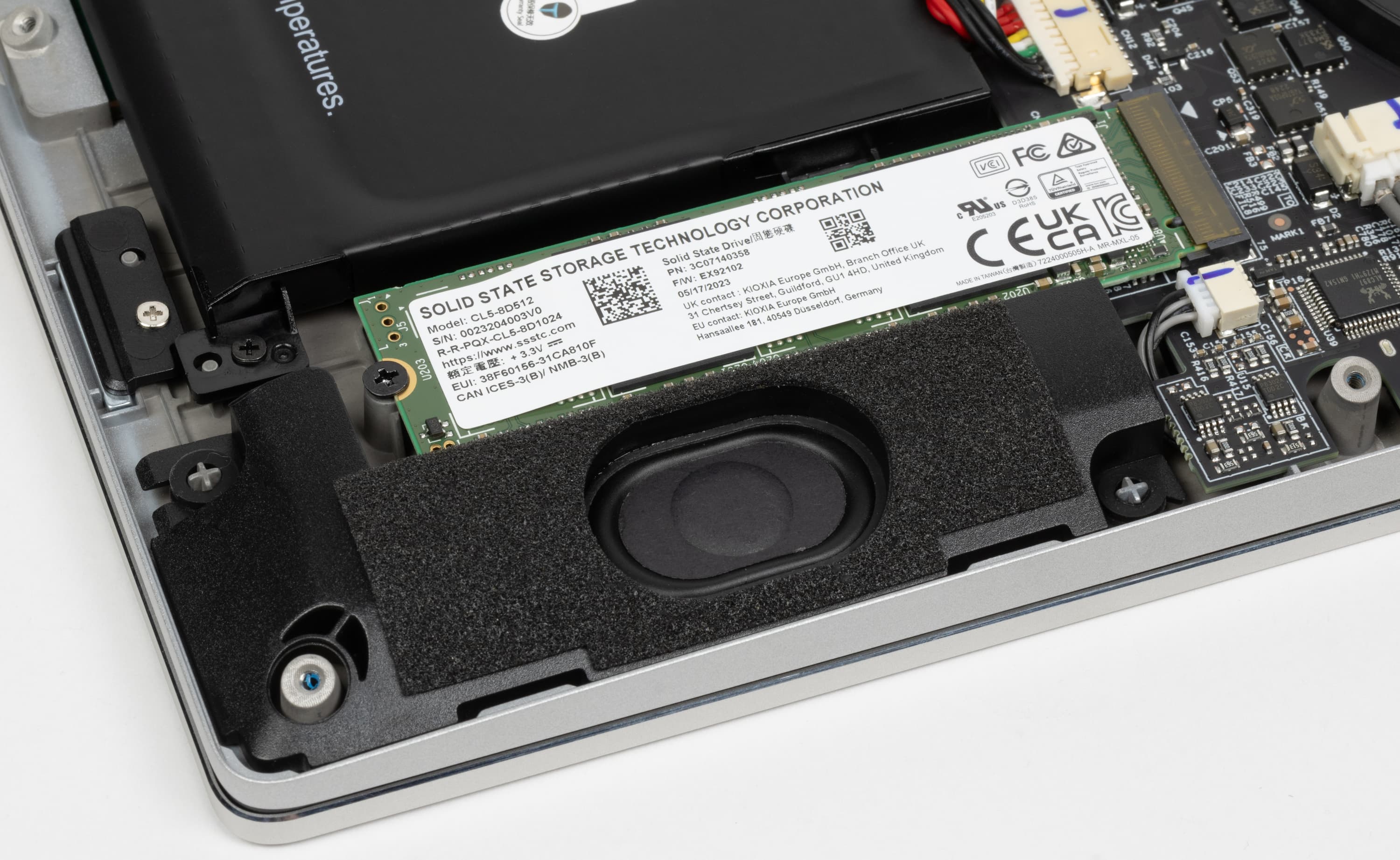 На крышке при взгляде изнутри обращает на себя внимание термопрокладка для отвода тепла от системного накопителя.
