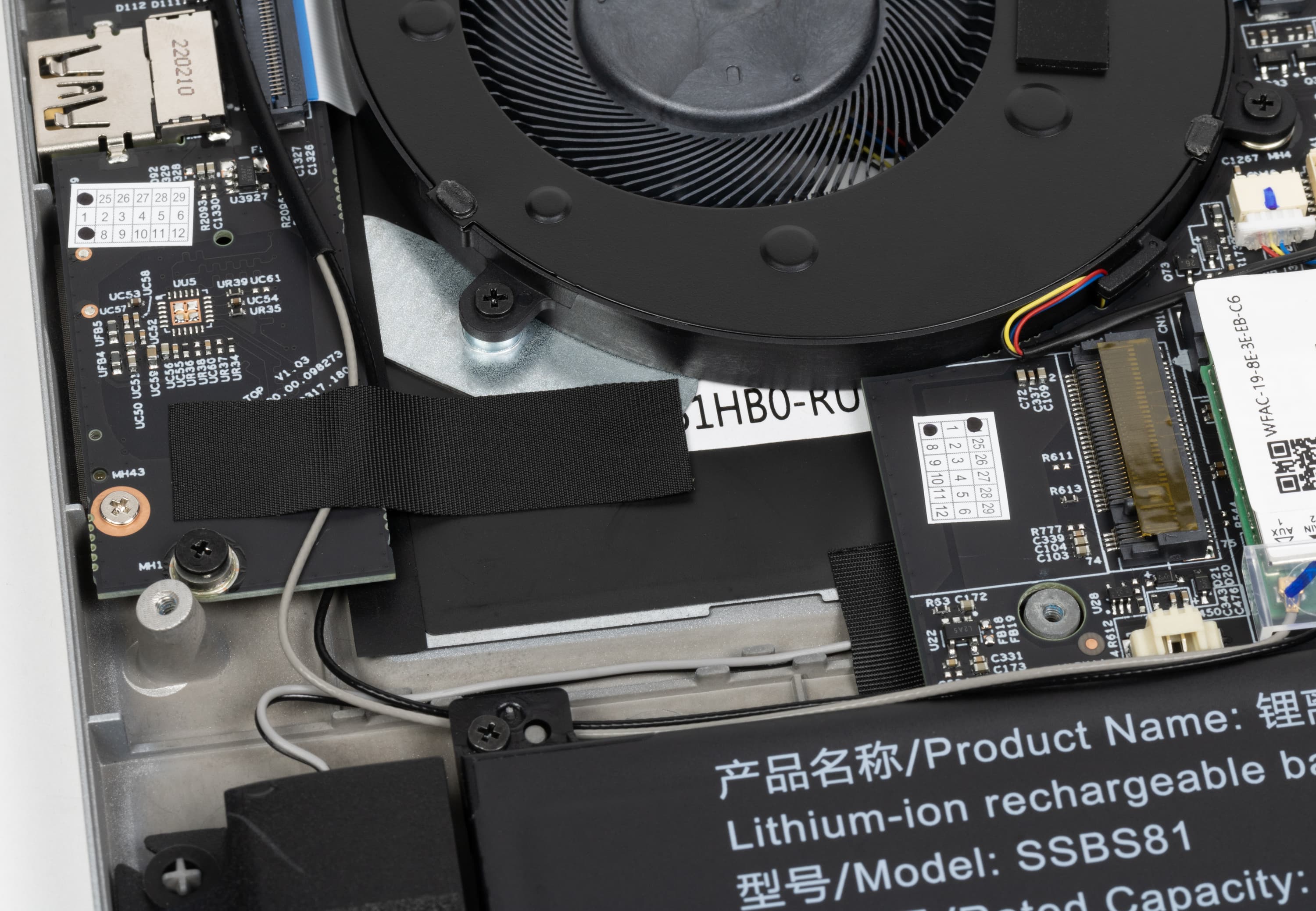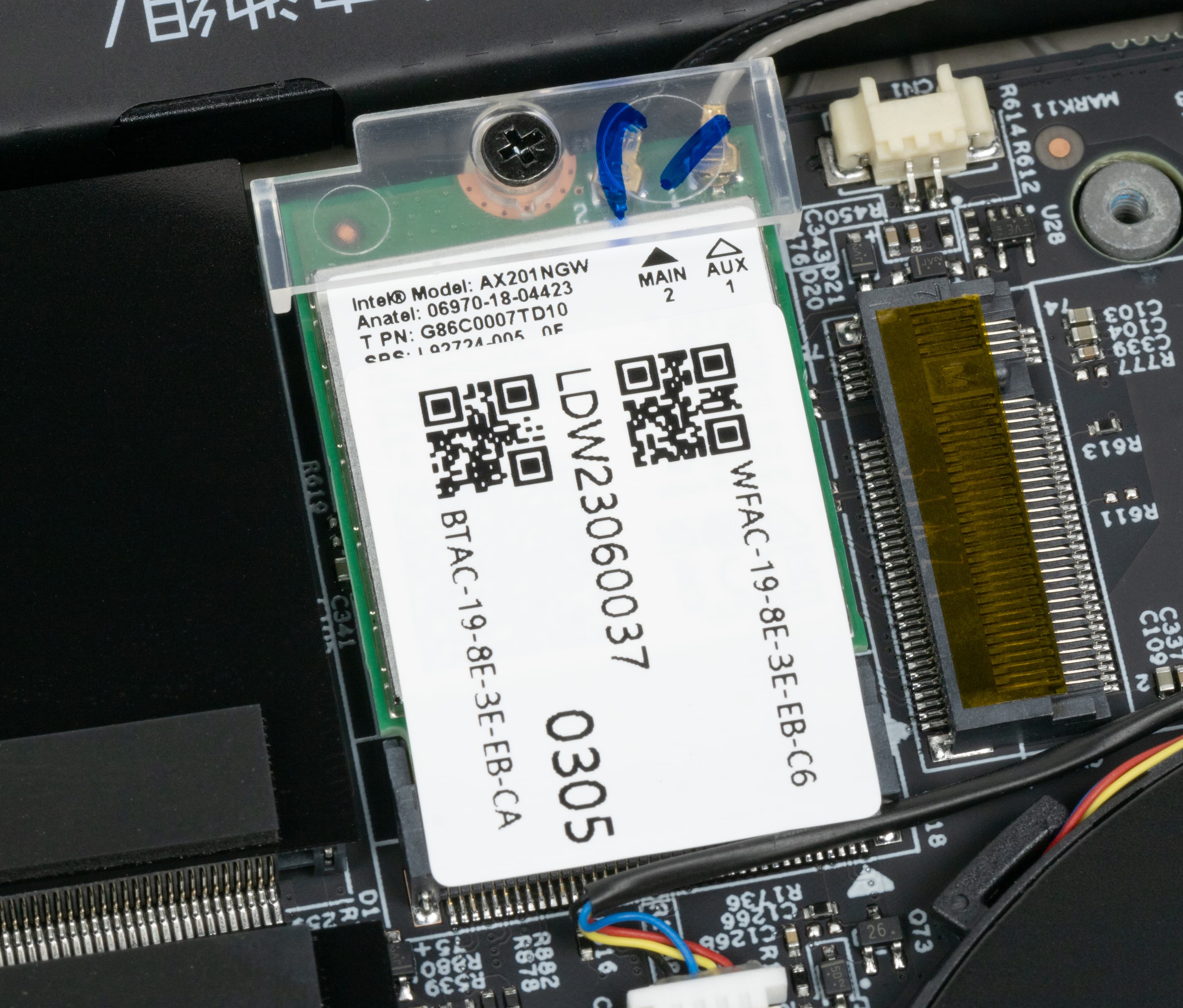 Между свободным слотом M.2 и разъемами для модулей оперативной памяти установлен двухдиапазонный (2,4/5/6 ГГц) PCIe-адаптер беспроводной связи Intel AX201D2W (Wi-Fi 6, 802.11ax), поддерживающий одновременный прием и передачу сигнала с использованием двух антенн при множественных подключениях (2×2 MIMO). Он же обеспечивает связь по Bluetooth.