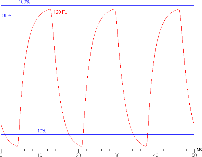Посмотрим, хватит ли такой скорости матрицы для вывода изображения с частотой 120 Гц. Приведем зависимость яркости от времени при чередовании белого и черного кадра при 120 Гц кадровой частоты: