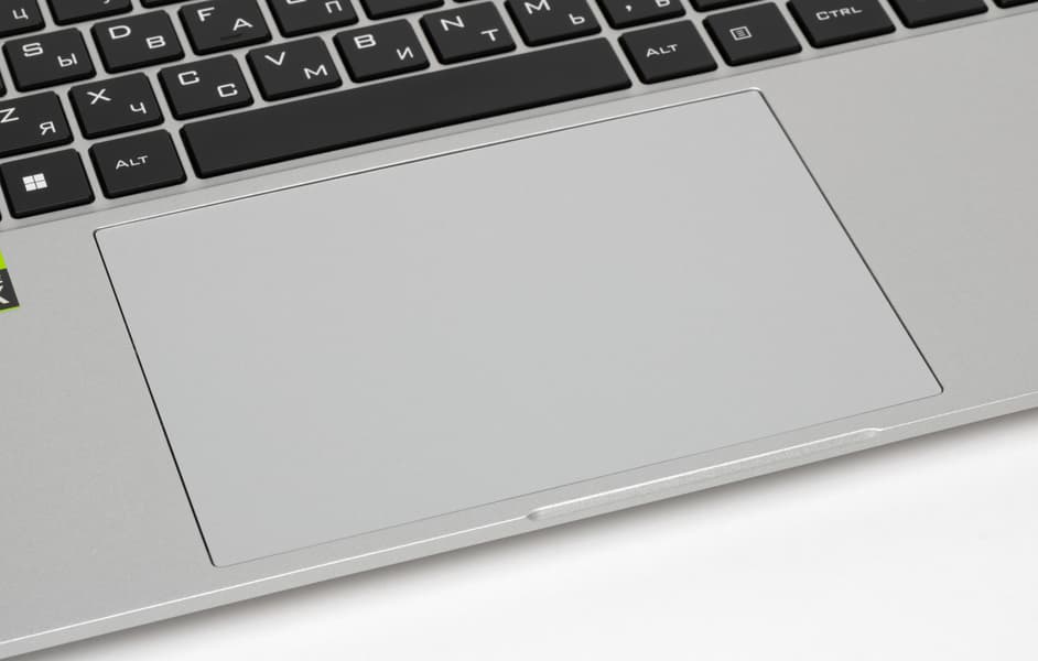 Под клавиатурой помещается увеличенный по площади, чуть утопленный кликпад размером 140×90 мм без выделенных кнопок. Дальняя от пользователя часть сенсорной площадки на нажатия реагирует плохо, их лучше совершать в ближних ⅔, где четкость срабатывания хорошая. С жестами, подразумевающими касание поверхности, проблем не возникает.