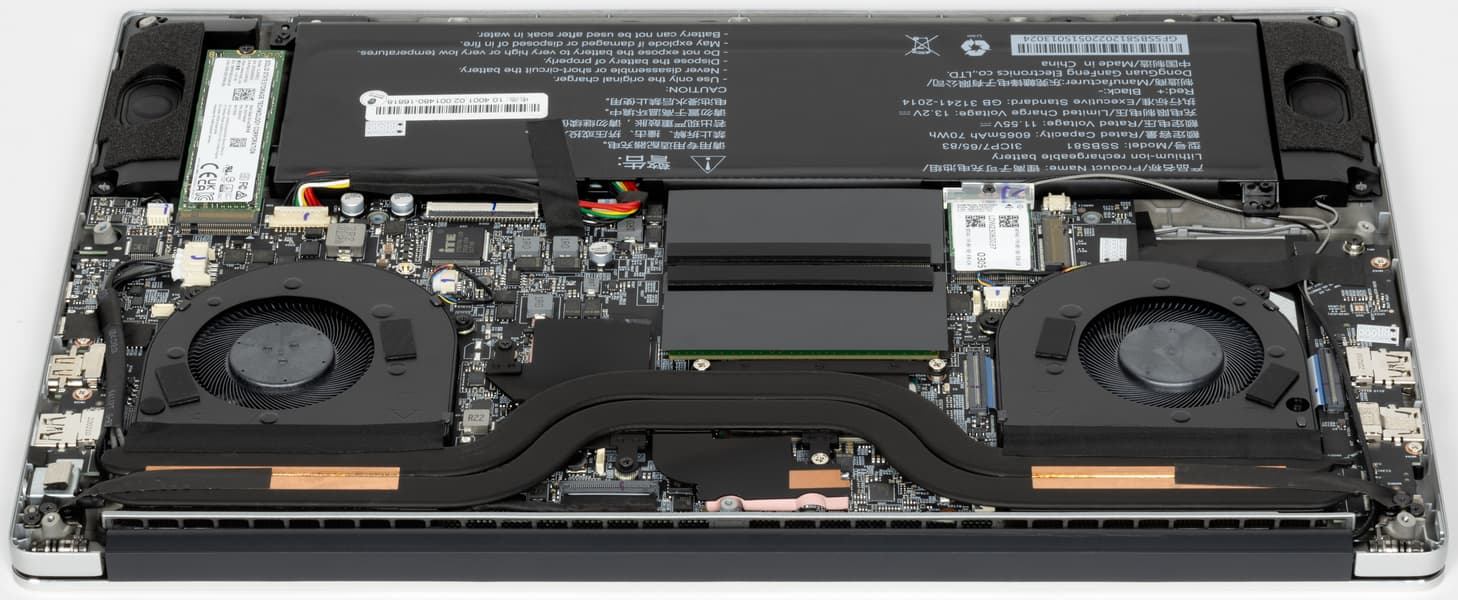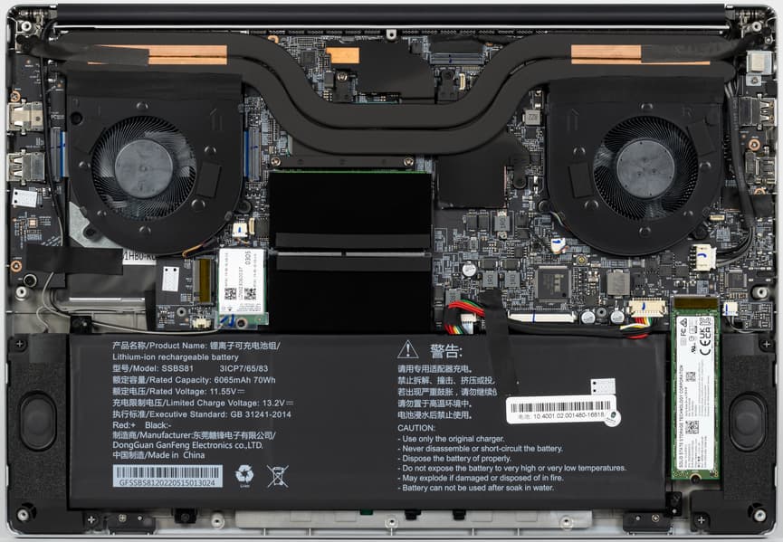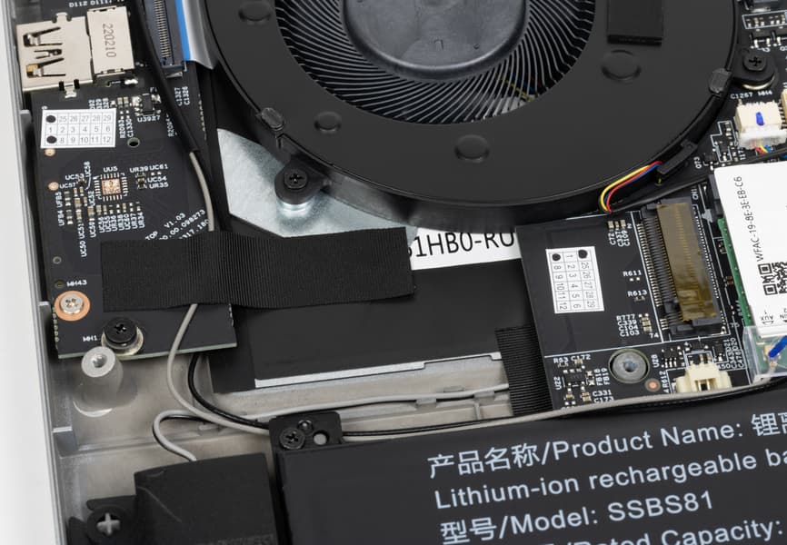 Внутри корпуса наибольший объем занимают система охлаждения, аккумулятор, слоты для установки модулей оперативной памяти и суппорты громкоговорителей. Плата с разрезным конструктивом, двухкомпонентная. Помимо главной части имеется правый сателлит (на фото он расположен слева).