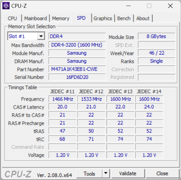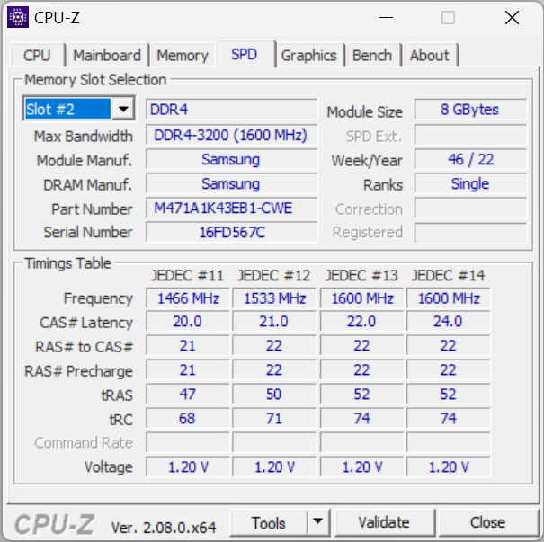 Машина располагает 16 ГБ оперативной памяти DDR4-3200 в виде двух 8-гигабайтных моделей SO-DIMM Samsung M471A1K43EB1-CWE. ОЗУ работает в двухканальном режиме.