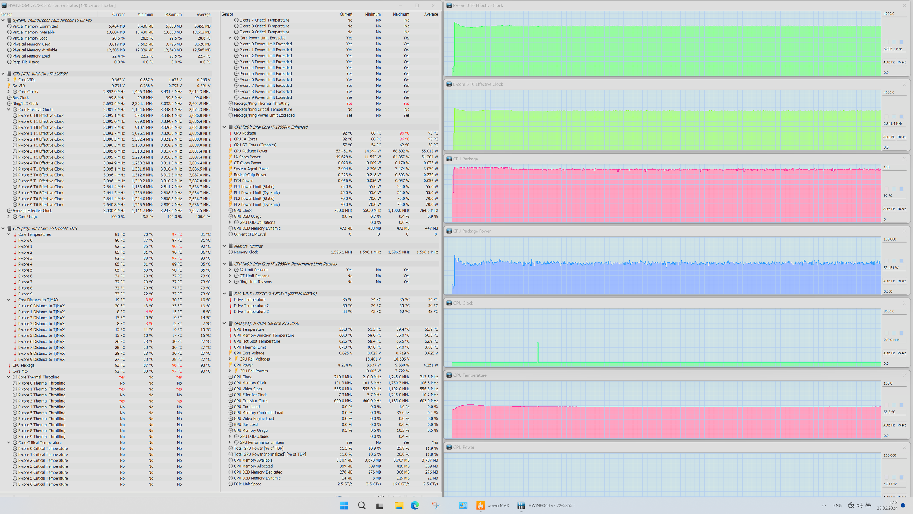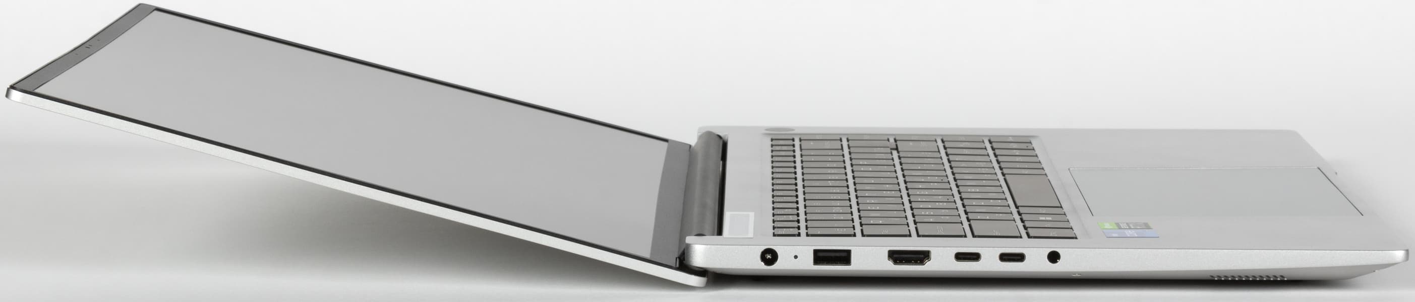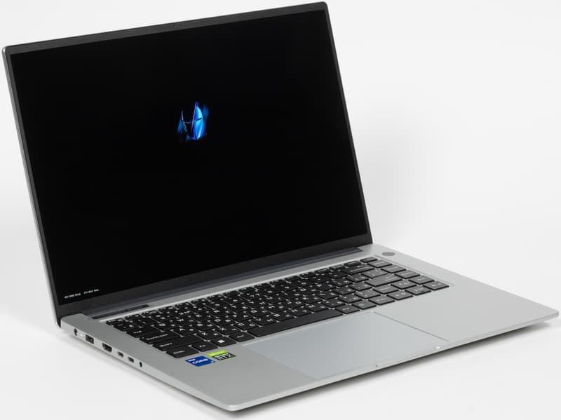 Мы испытали мобильный ПК, ставший следствием аппаратной гибридизации. Внешне это типичная бизнес-модель с относительно тонким корпусом, изготовленным из магниевого сплава, характерным расположением разъемов и портов справа и слева и выходным трактом системы охлаждения в щели между задней панелью и выступом крышки. В аппаратном оснащении главенствуют процессор Intel Core i7-12650H и — внимание! — дискретная видеокарта Nvidia GeForce RTX 2050 Laptop с 4 ГБ GDDR6. Экран размером 16 дюймов по диагонали обладает разрешением 2.5K при соотношении сторон 16:10 (это более удобно для офисной работы) с хорошей максимальной яркостью. Объем оперативной памяти 16 ГБ набран двумя модулями SO-DIMM в двух слотах. Вывод видео производится через HDMI и два порта USB 3.2 Gen2, поэтому к устройству можно одновременно подключить три внешних монитора. Из традиционно деловых аксессуаров доступна веб-камера (720p) без механической шторки, а вот сканером отпечатков пальцев машина не оснащена. Системный накопитель SSST/Kioxia CL5-8D512 вместимостью 512 ГБ хотя и подключен к PCIe 4 ×4, но демонстрирует скорости файловых операций, более присущие жесткому диску, чем NVMe. Он является главным источником сложностей при оценке производительности ноутбука в реальных приложениях, поскольку портит хорошие показатели быстродействия своей чересчур медленной работой.