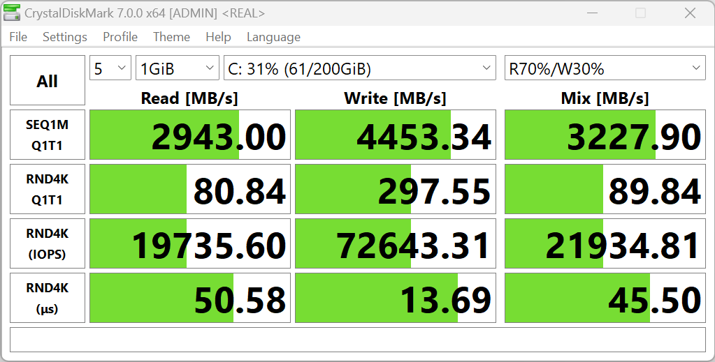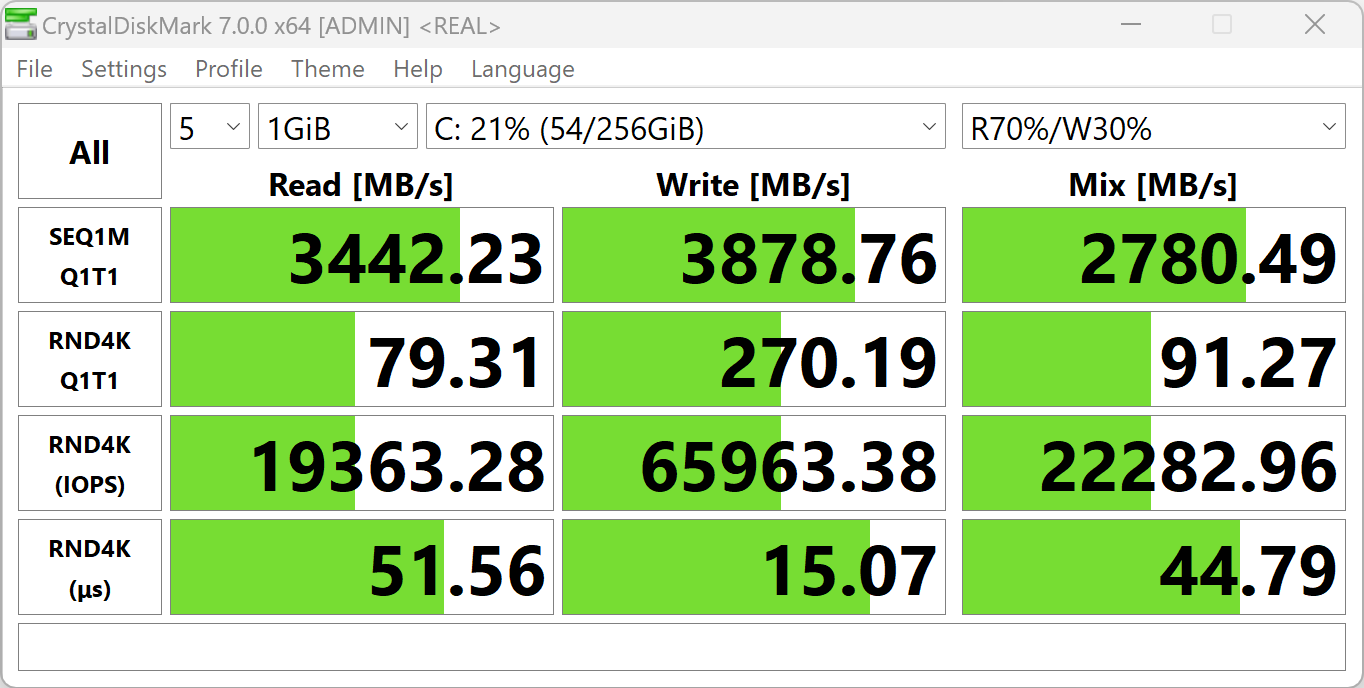 Есть, впрочем, и слабая сторона, которая заметно понижает достигнутое — она связана с выявленным несовершенством системного накопителя, интегральный результат которого составляет лишь 27 баллов — это втрое ниже, чем у референсного настольного ПК с накопителем SATA SSD и в 14 раз хуже, чем у лидера состязаний Intel NUC.