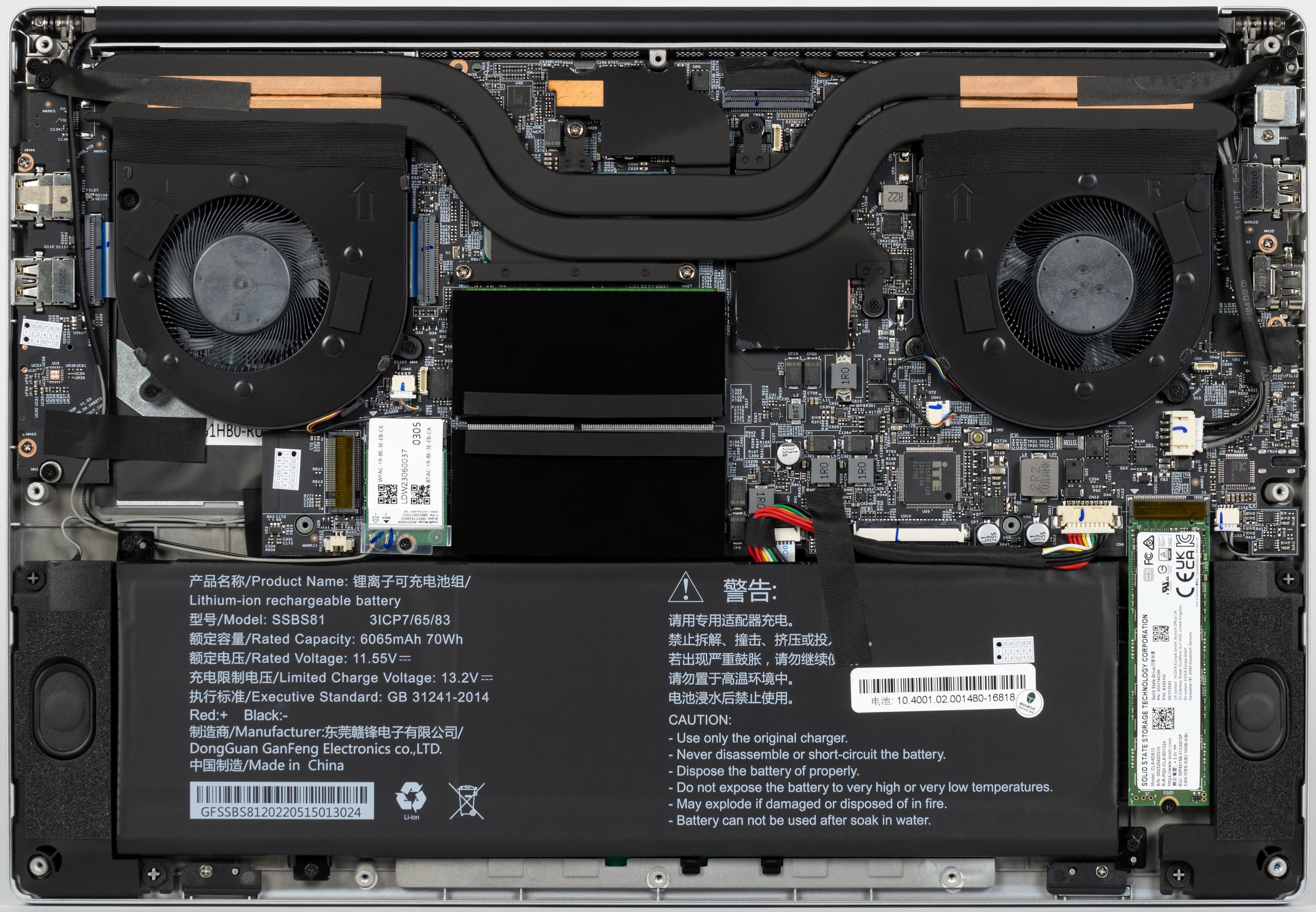 Заводская пайка нареканий не вызывает (благо делается на автоматических линиях), а монтаж оставляет желать лучшего: плохо защищены (или не защищены вовсе) провода антенны беспроводного адаптера и питания вентиляторов, силовой кабель аккумулятора. Много заклеек липкой лентой.