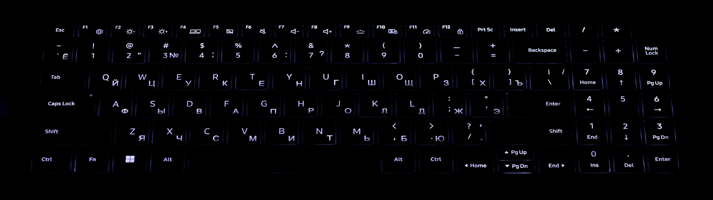 Клавиатура снабжена двухуровневой по яркости подсветкой (третье состояние — подсветка выключена), переключение между уровнями производится повторным нажатием аккорда Fn+F6. Все символы и торцы кнопок подсвечиваются одинаково.