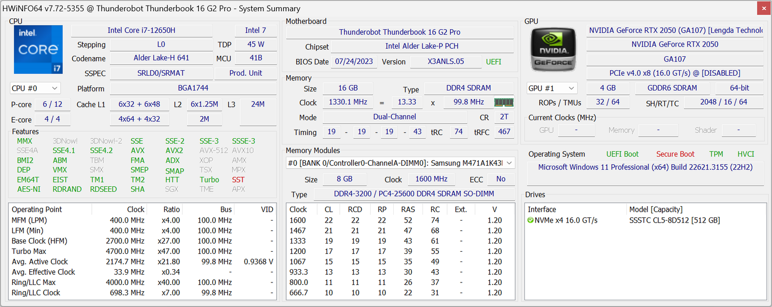 Thunderobot Thunderbook 16 G2 Pro комплектуется накопителем NVMe вместимостью 512 ГБ SSST/Kioxia CL5-8D512 с интерфейсом подключения PCIe Gen 4.0 ×4.
