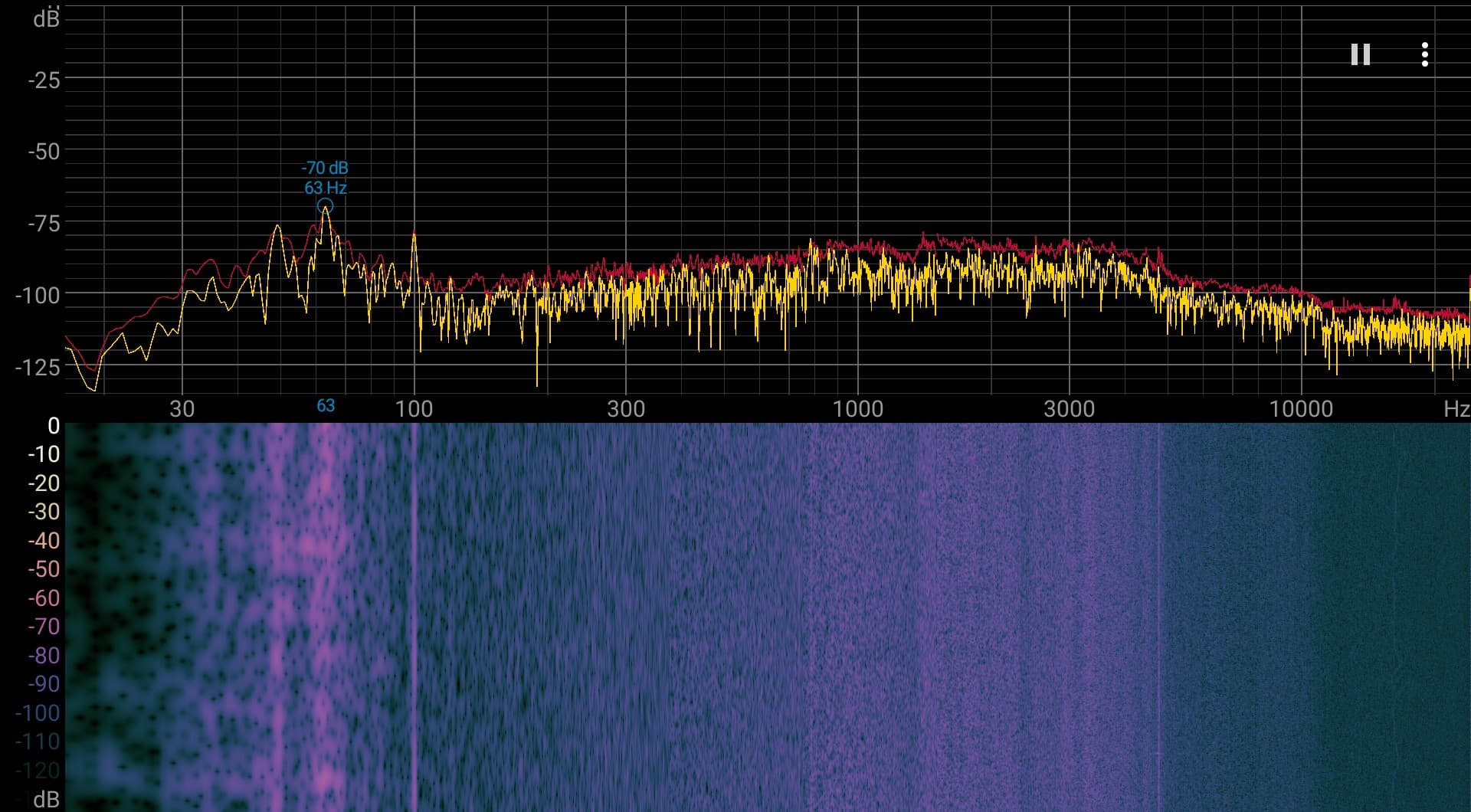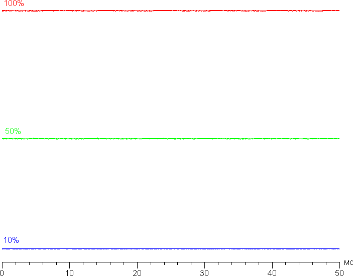 На любом уровне яркости значимая модуляция подсветки отсутствует, поэтому нет и никакого мерцания экрана (нет ШИМ). В доказательство приведем графики зависимости яркости (вертикальная ось) от времени (горизонтальная ось) при различных значениях настройки яркости: