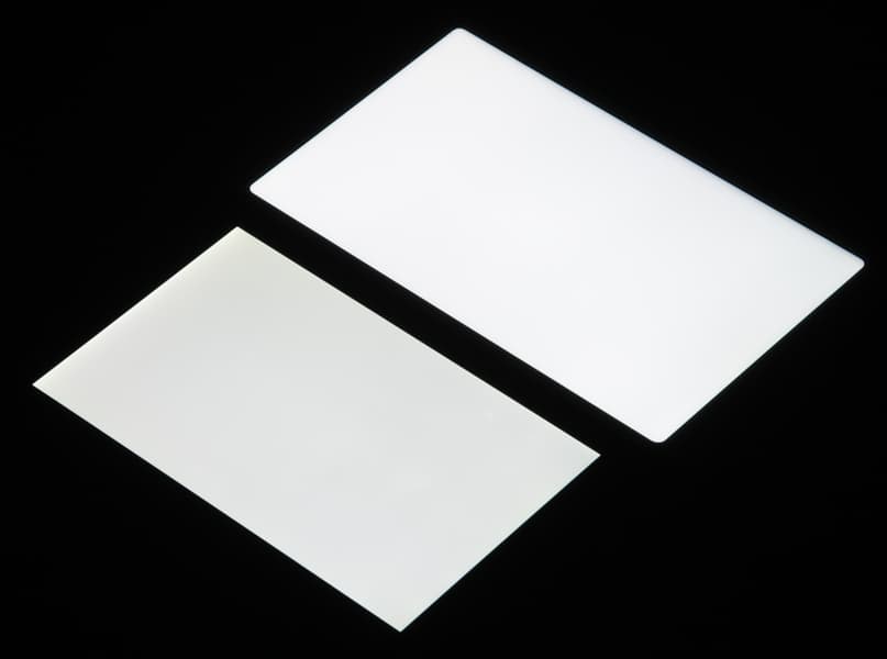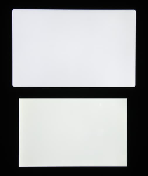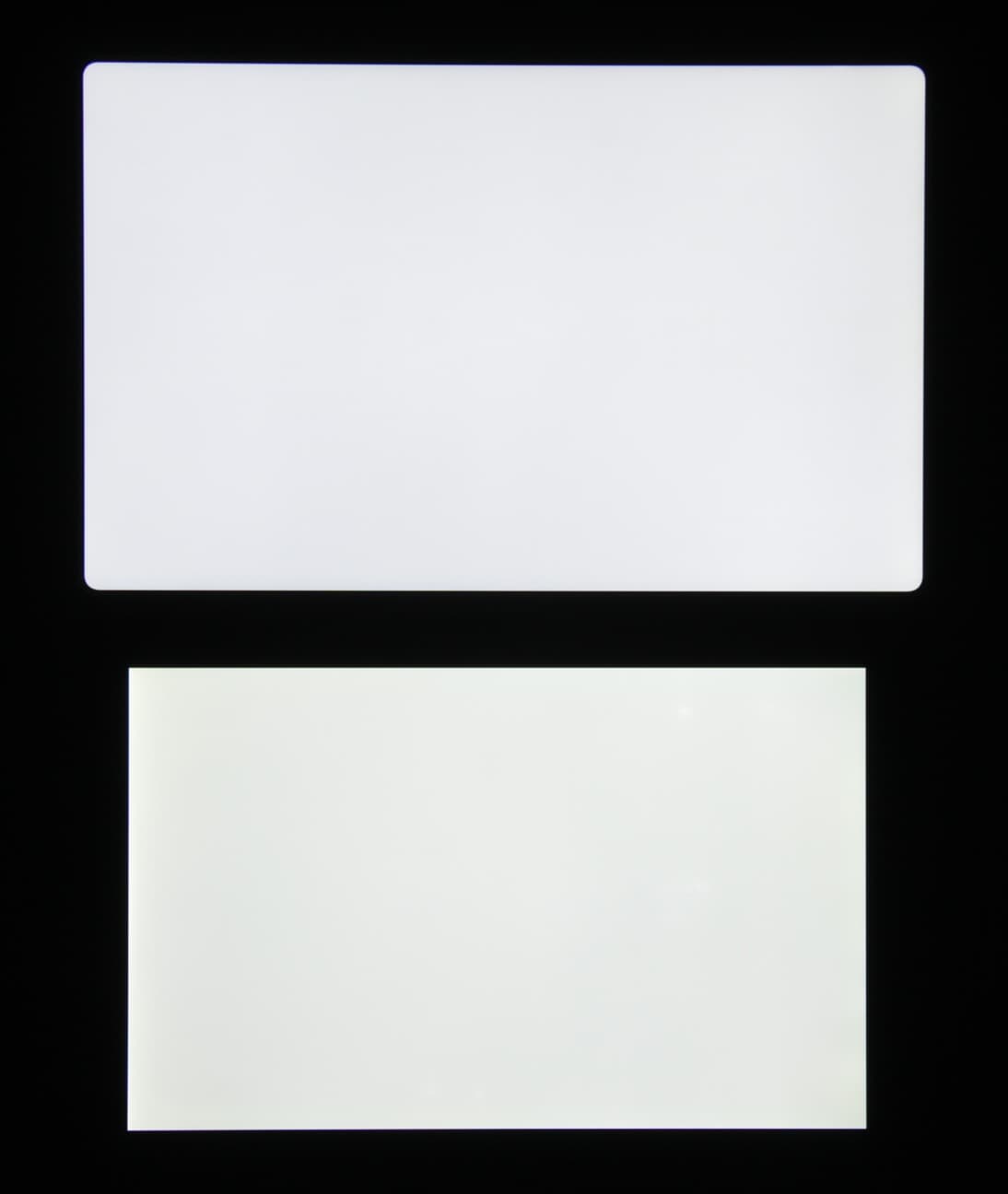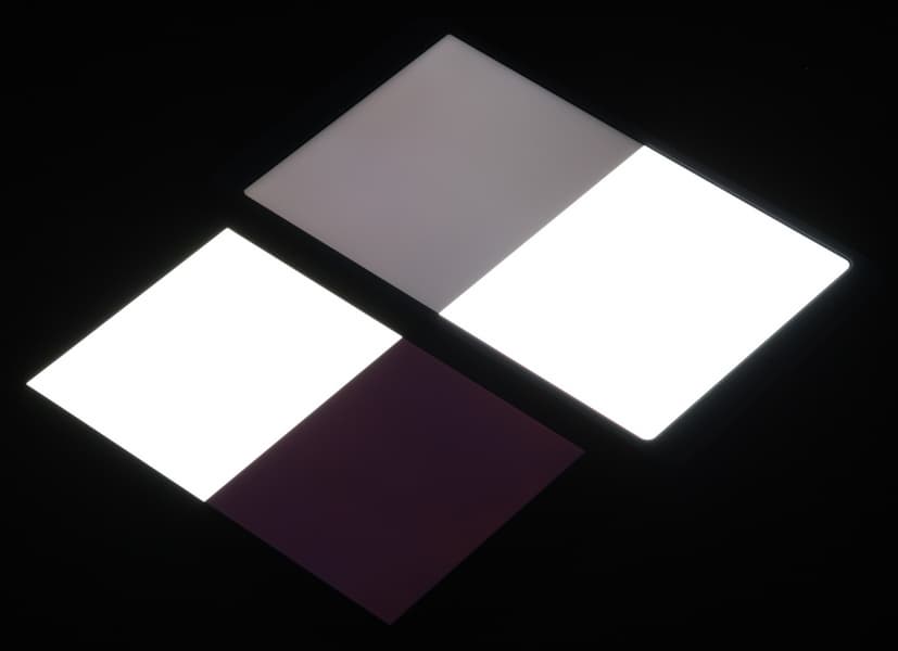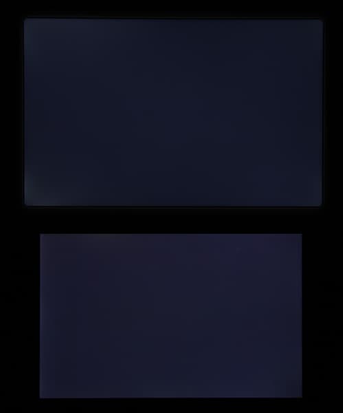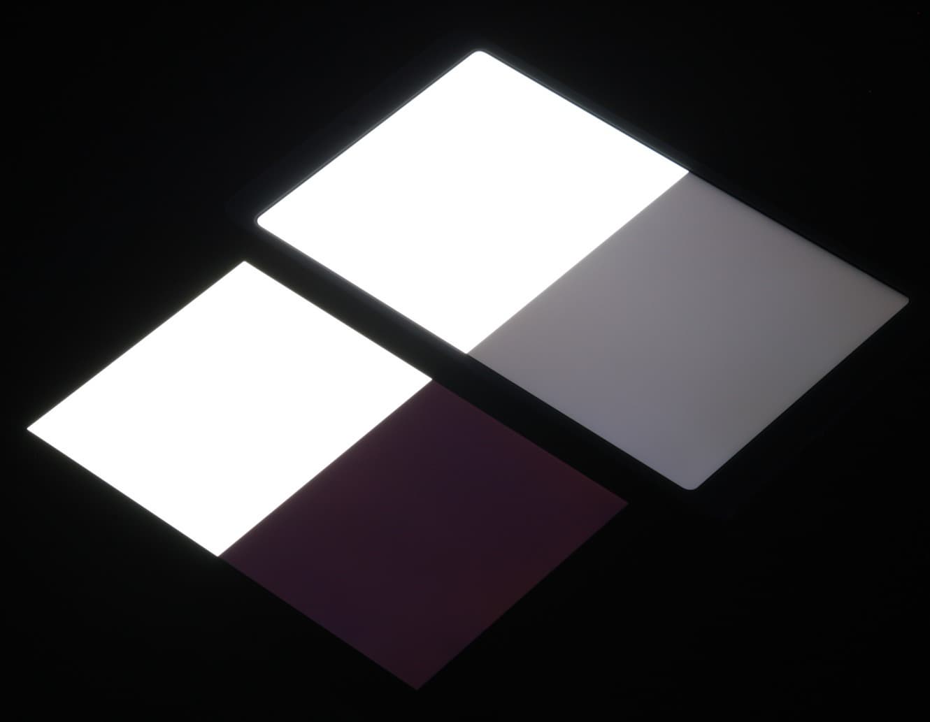 Яркость под углом у экранов уменьшилась (как минимум в 4 раза, исходя из разницы в выдержке), но у Xiaomi Mi Pad 4 экран под этим углом немного ярче. Черное поле при отклонении по диагонали сильно высветляется, но остается условно нейтрально-серым. Фотографии ниже это демонстрируют (яркость белых участков в перпендикулярном плоскости экранов направлении одинаковая!):