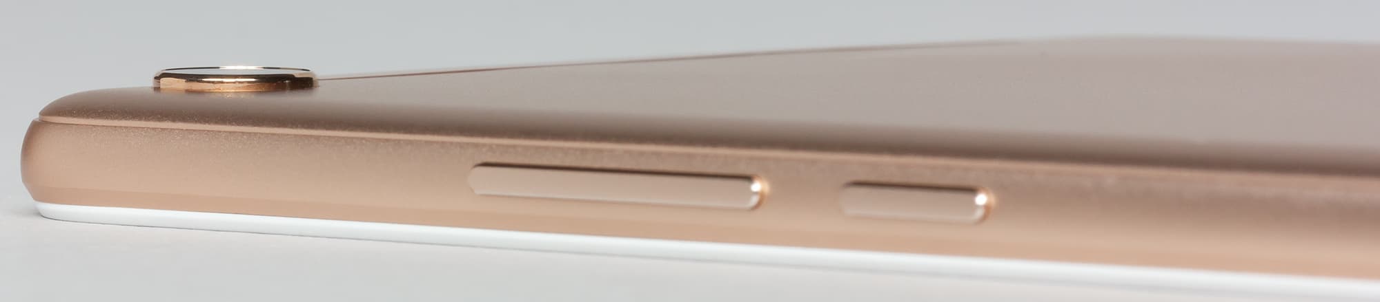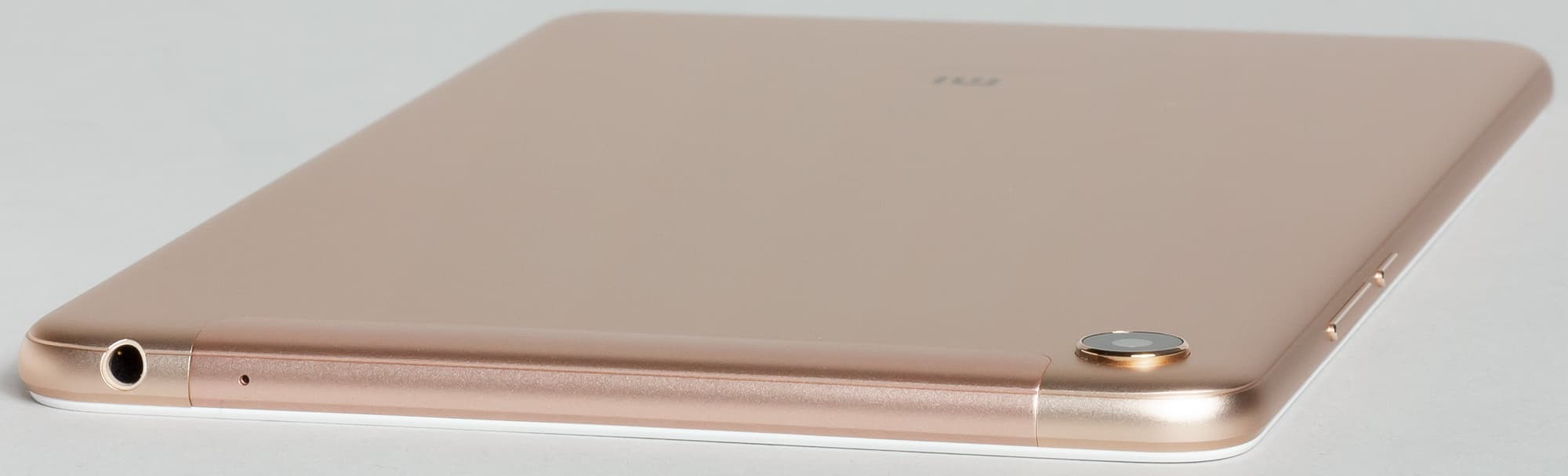 Внешний вид планшета производит приятное впечатление. Металлический корпус золотистого (в случае нашего экземпляра) оттенка выглядит лаконично и недешево, хотя если приглядеться, заметно, что он не из цельного куска алюминия, как у iPad mini, а из двух частей: между тыльной крышкой и гранями есть стык.