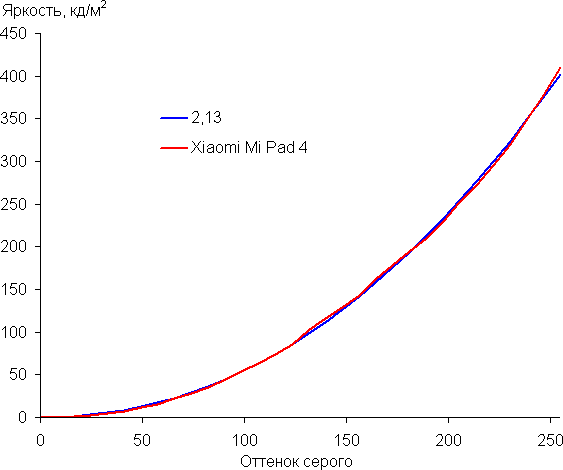 Контрастность (примерно в центре экрана) высокая — порядка 900:1. Время отклика при переходе черный-белый-черный равно 27 мс (18 мс вкл. + 9 мс выкл.). Переход между полутонами серого 25% и 75% (по численному значению цвета) и обратно в сумме занимает 39 мс. Построенная по 32 точкам с равным интервалом по численному значению оттенка серого гамма-кривая не выявила завала ни в светах, ни в тенях. Показатель аппроксимирующей степенной функции равен 2,13, что немного ниже стандартного значения 2,2. При этом реальная гамма-кривая немного отклоняется от степенной зависимости: