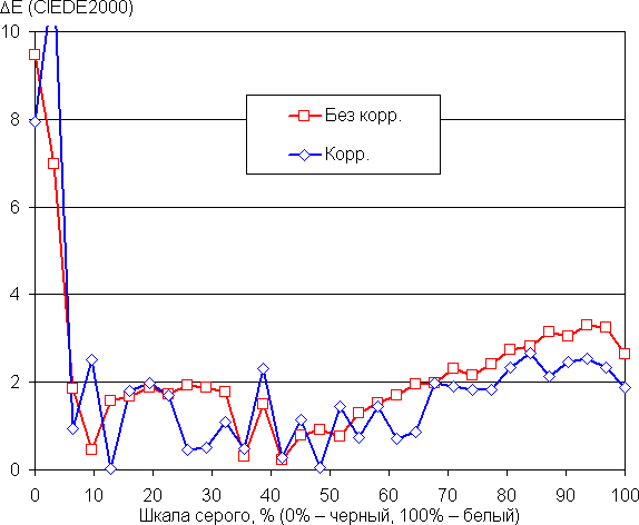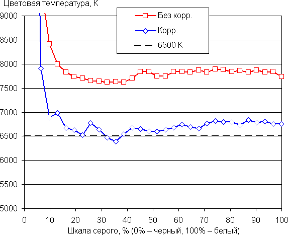 Результат после ручной коррекции (как на снимке выше) очень хороший (см. графики ниже), поскольку цветовая температура становится близкой к стандартным 6500 К, а отклонение от спектра абсолютно черного тела (ΔE) ниже 10, что для потребительского устройства считается неплохим показателем. При этом цветовая температура и ΔE мало изменяются от оттенка к оттенку — это положительно сказывается на визуальной оценке цветового баланса. (Самые темные области шкалы серого можно не учитывать, так как там баланс цветов не имеет большого значения, да и погрешность измерений цветовых характеристик на низкой яркости большая.)