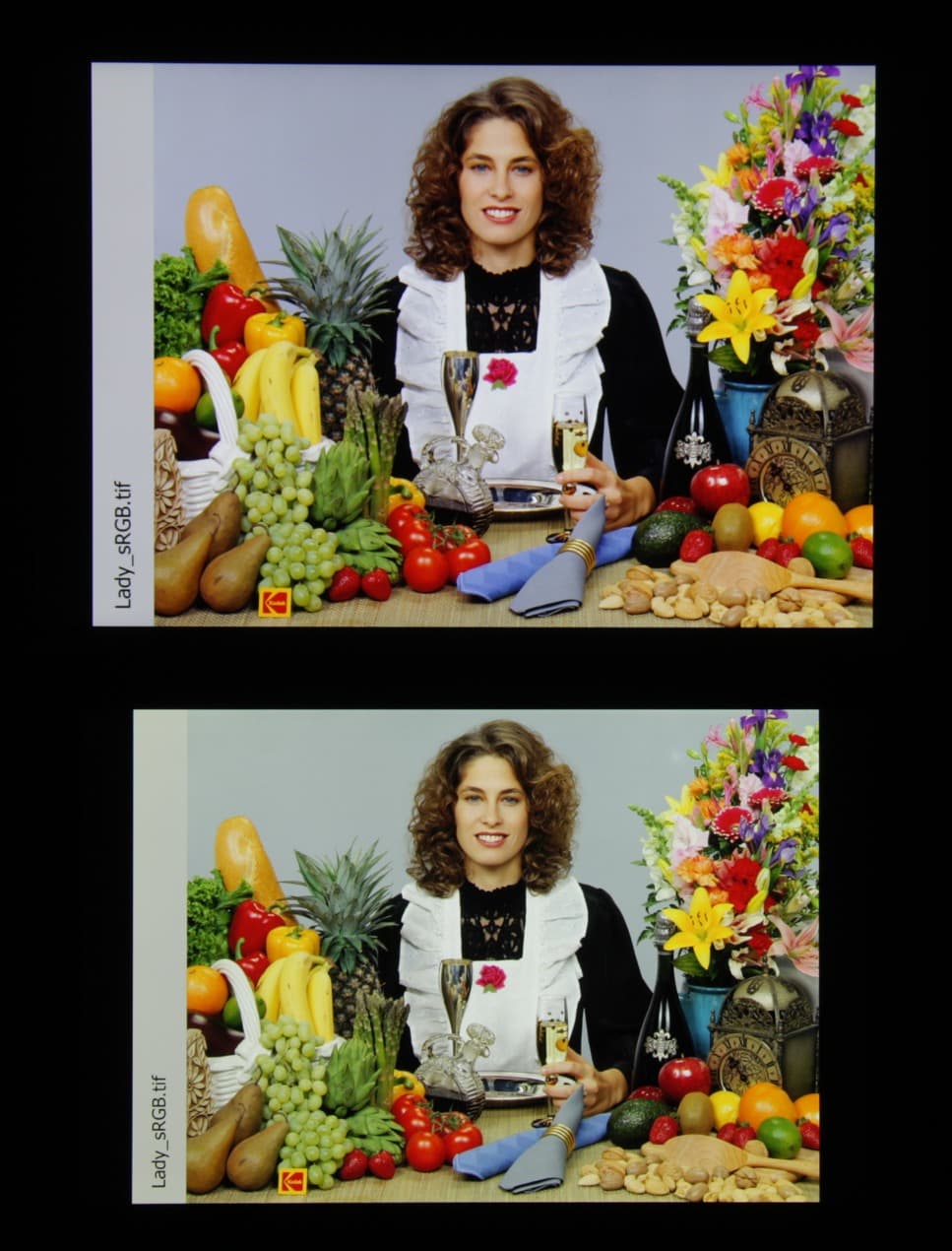По умолчанию цветовая температура высоковата, порядка 7700 К. Однако в этом устройстве при выборе профиля Автонастройка есть возможность скорректировать цветовой баланс с помощью регулировки оттенка точкой на цветовом круге или выбирая предустановленные варианты. Кроме того, коррекция выполняется автоматически при выборе профиля Стандартная.