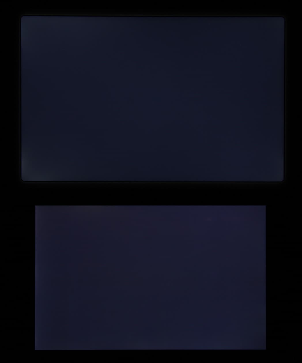 При перпендикулярном взгляде равномерность черного поля средняя, так как ближе к углам экран немного высветляется: