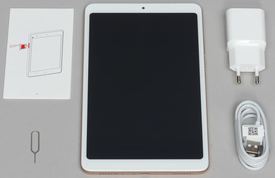 Идентична и комплектация: зарядное устройство 5 В 2 А, кабель USB-C, конверт с листовками и скрепка для извлечения слота для карты памяти.