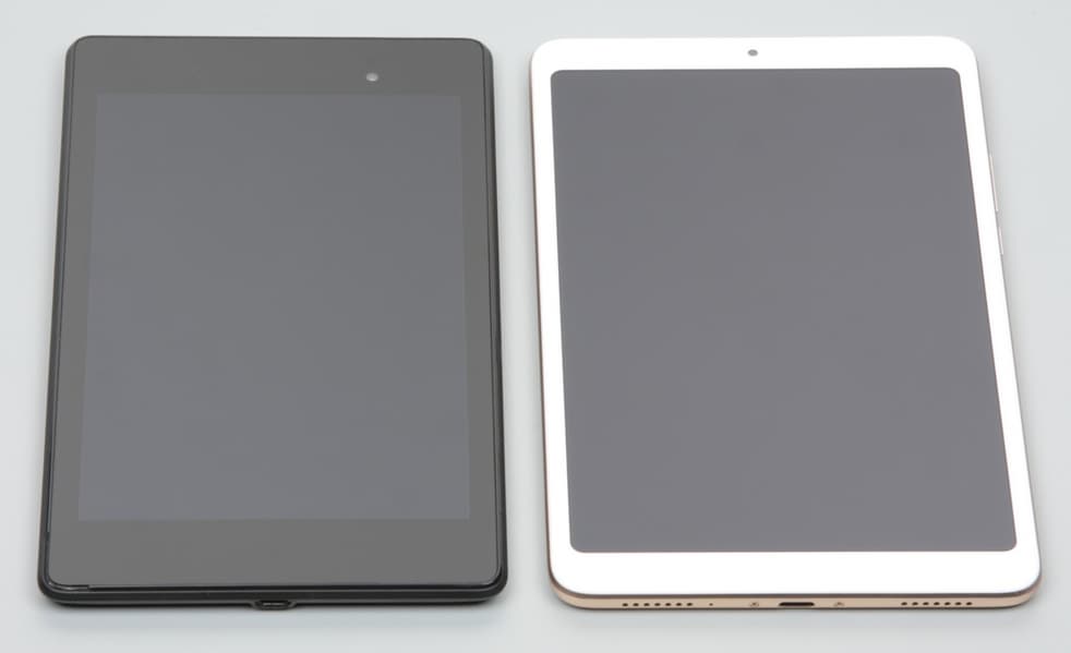 Лицевая поверхность экрана выполнена в виде стеклянной пластины с зеркально-гладкой поверхностью, устойчивой к появлению царапин. Судя по отражению объектов, антибликовые свойства экрана примерно как у экрана Google Nexus 7 (2013) (далее просто Nexus 7). Для наглядности приведем фотографию, на которой в выключенных экранах отражается белая поверхность (слева — Nexus 7, справа — Xiaomi Mi Pad 4, далее их можно различать по размеру):