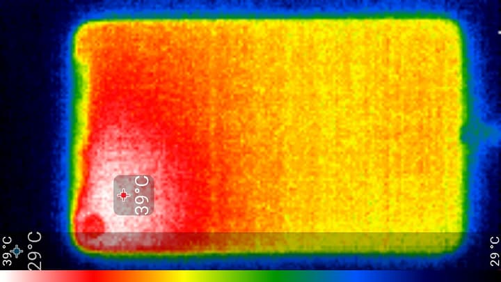 Нагрев выше в верхней правой части аппарата, что, видимо, соответствует расположению микросхемы SoC. По данным теплокамеры, максимальный нагрев составил 39 градусов (при температуре окружающего воздуха в 24 градуса), это не очень много.