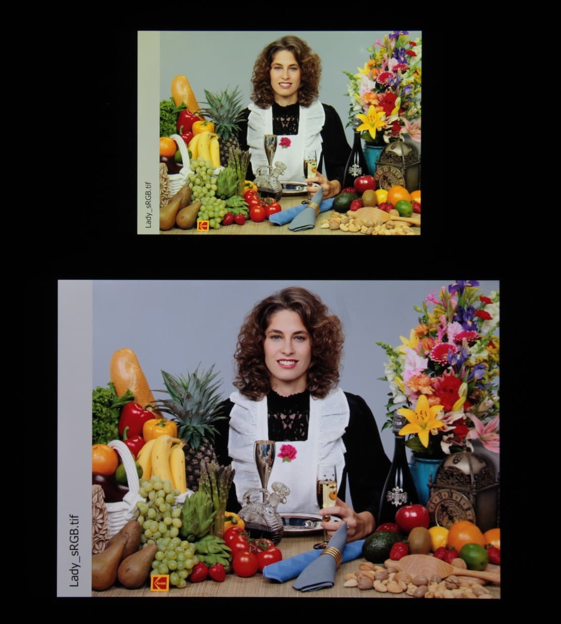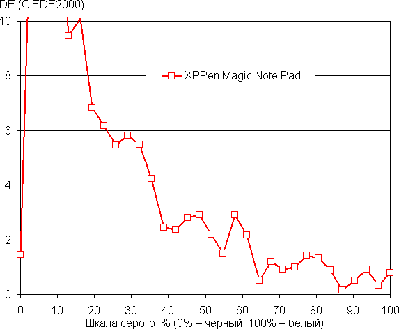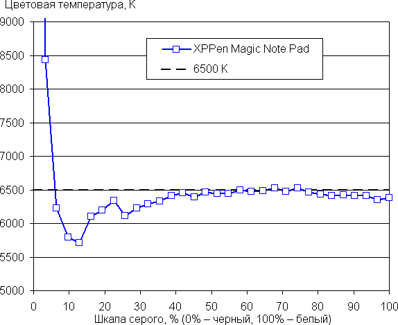 По умолчанию даже при выборе профиля sRGB цветовая температура высоковата — порядка 7000 К на белом фоне. Однако после коррекции (точка на круге — как на снимке выше) цветовой баланс приемлемый — цветовая температура близка к стандартным 6500 К, а ΔE на большей части шкалы серого ниже 10, что для потребительского устройства считается хорошим показателем. При этом хотя бы цветовая температура мало изменяется от оттенка к оттенку серого — это положительно сказывается на визуальной оценке цветового баланса. (Самые темные области шкалы серого можно не учитывать, так как там баланс цветов не имеет большого значения, да и погрешность измерений цветовых характеристик на низкой яркости большая.)