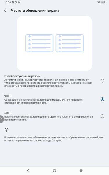 В настройках экрана можно включить режим с повышенной до 90 Гц частотой обновления. В режиме 90 Гц плавность прокрутки списков меню заметно повышается.