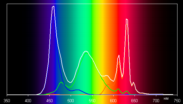 Спектры компонент (то есть спектры чистых красного, зеленого и синего цветов) достаточно хорошо разделены: