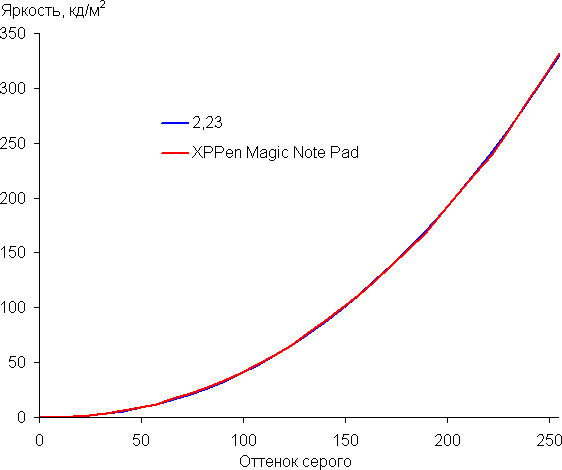 Построенная по 32 точкам с равным интервалом по численному значению оттенка серого гамма-кривая не выявила завала ни в светах, ни в тенях. Показатель аппроксимирующей степенной функции равен 2,23, что близко к стандартному значению 2,2. При этом реальная гамма-кривая мало отклоняется от степенной зависимости: