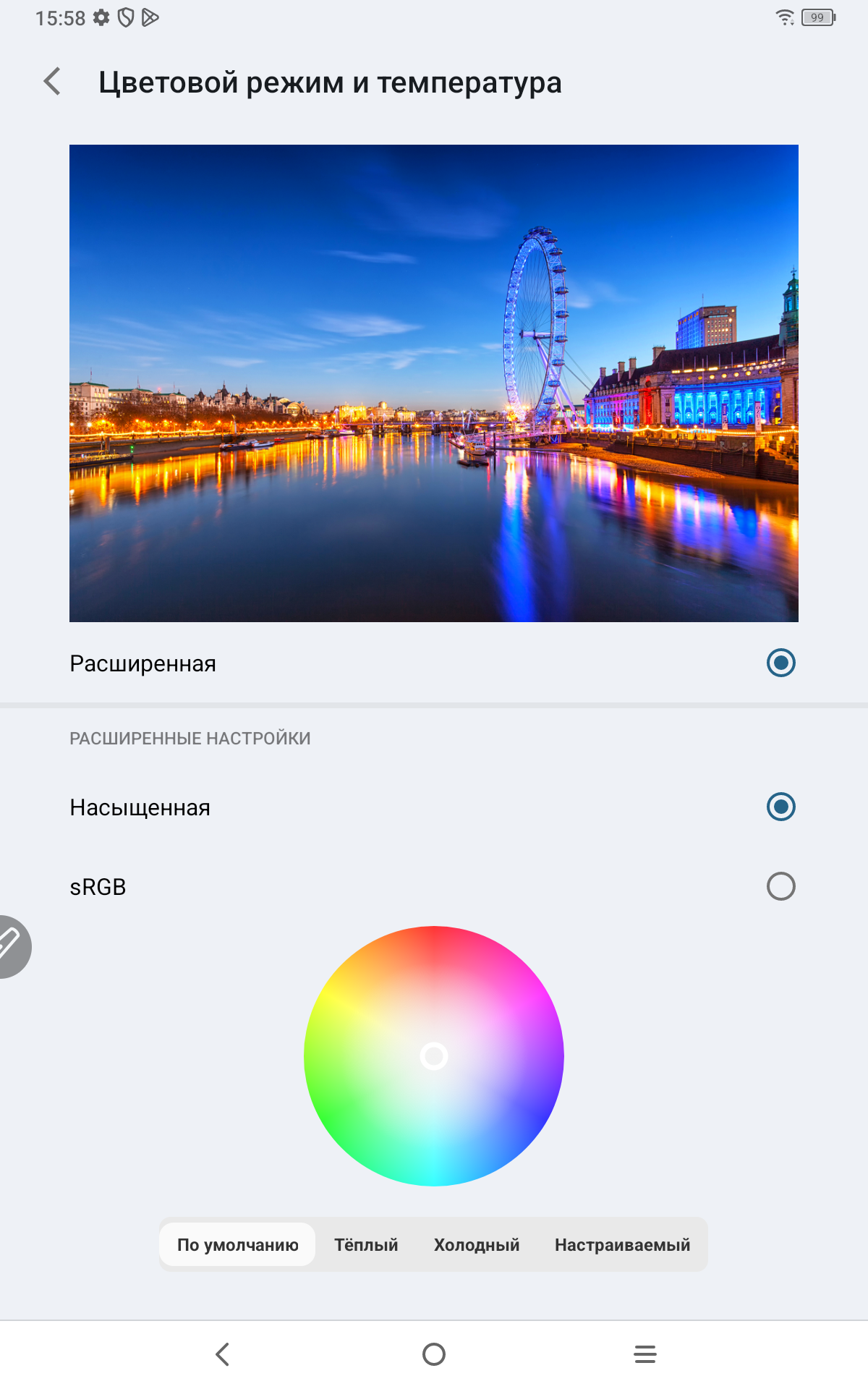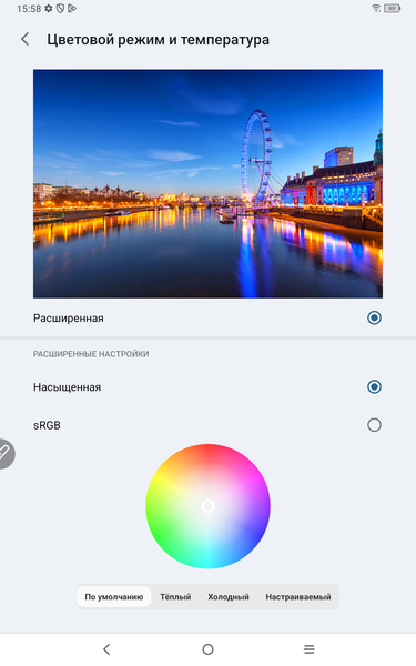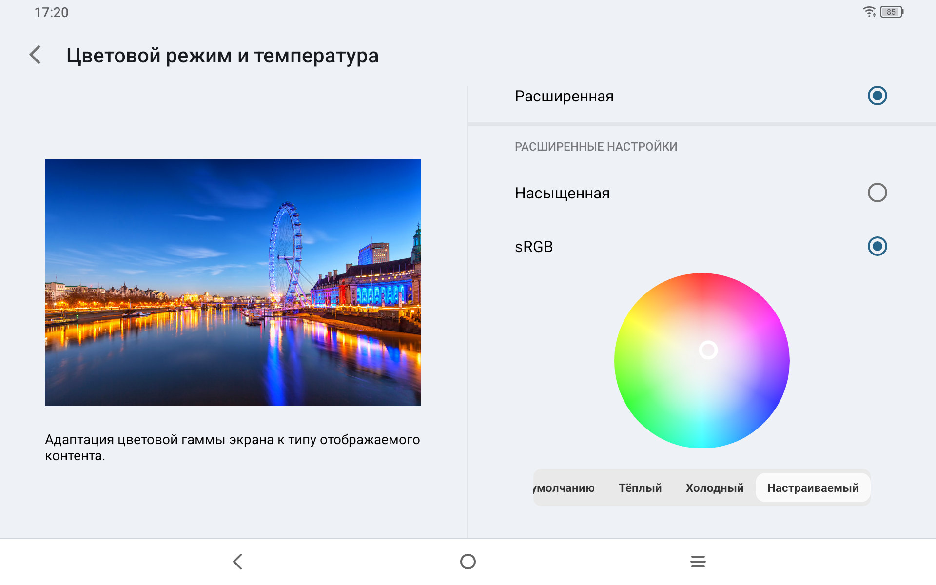 В этом устройстве при выборе профилей Насыщенная и sRGB есть возможность скорректировать цветовой баланс с помощью регулировки оттенка на цветовом круге или просто выбором одного из трех предустановленных профилей.