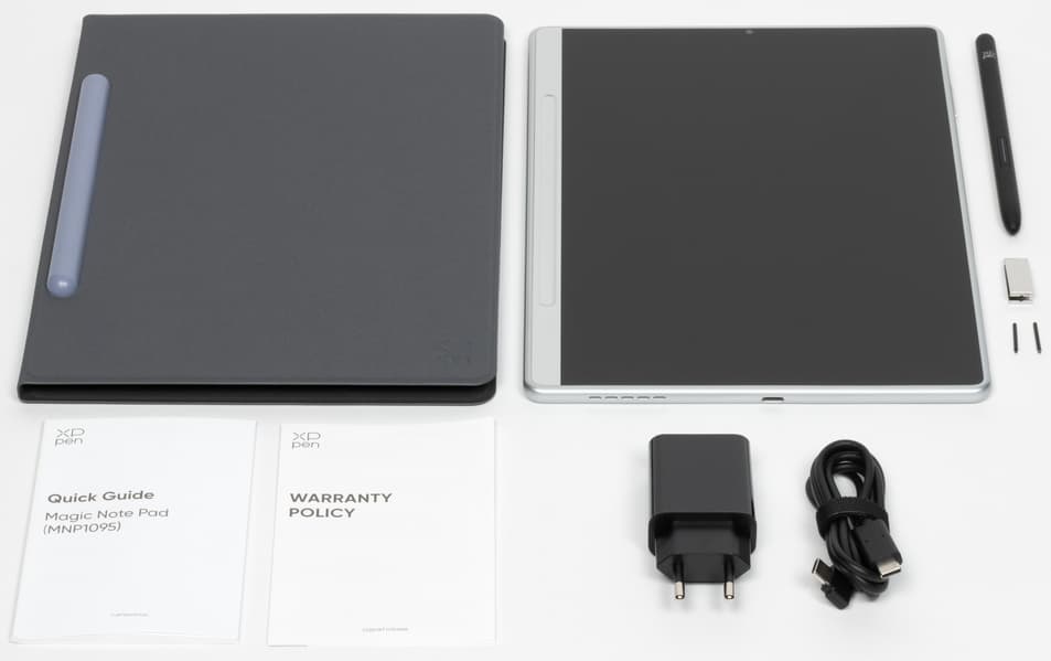 Внутри — само устройство, фирменная обложка, закрывающая планшет с обеих сторон, стилус X3 Pro Pencil 2, два дополнительных стерженька к нему, зарядное устройство, кабель USB-C — USB-C, краткое руководство пользователя (на английском) и гарантийный талон.