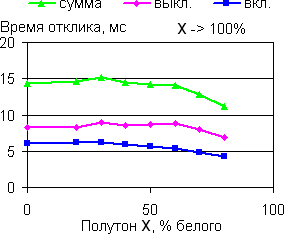 Мы измерили времена отклика при переходах от черного к белому и между полутонами. В случае полутонов мы проводили три вида измерений: для фиксированного полутона (X) измеряли время отклика при переходе от черного до X, от X до белого, и для перехода между полутонами в окрестности X, отстоящими от X на фиксированное значение (мы выбрали его равным 10%, так как считаем 20% минимальной имеющей значение разницей между полутонами). Тестирование проводилось при DVI-подключении в режиме 1920 на 1200 при 60 Гц.