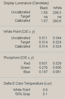 Вспоминая обещанные 500 Кд для 100% яркости белого, мы вполне адекватно оцениваем реальный показатель 2416W — почти 300 Кд. Для большой диагонали это неплохо. Зато очень плох черный цвет — почти 1,6 Кд при 0% яркости белого! Если это и не антирекорд, то он весьма близок. И наверняка свою роль сыграл аналоговый сигнал (практически всегда при контрольных замерах мы видим более высокие показатели при использовании DVI). В итоге расчетный коэффициент контрастности составил менее 190:1, что, несомненно, очень мало, и особенно для просмотра видео.