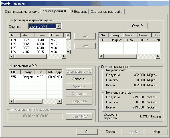 Список транспондеров является общим, так что, в случае отсутствия необходимого его следует добавить в предыдущем разделе. Программа позволяет при необходимости изменять MAC-адрес (наличие аппаратного адреса избавляет от необходимости придумывать его самостоятельно). Здесь же доступна статистика, показывающая скорость передачи, количество принятого трафика и возможных ошибок.