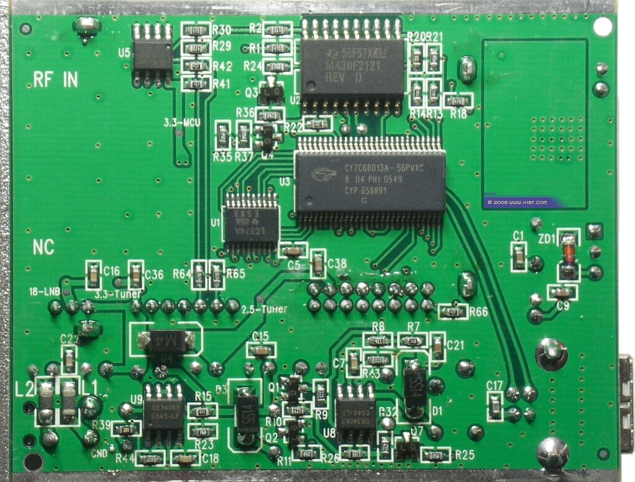 Согласно имеющейся на момент выхода обзора Nextorm NCS120 информации, за управление LNB и работа с протоколом DiSEqC отвечал микроконтроллер TI MSP430f2121 от Texas Instruments Incorporated, действительно, имеющийся на предыдущих ревизиях. На фото плата ревизии V2.0(B02) от TV878DS USB.