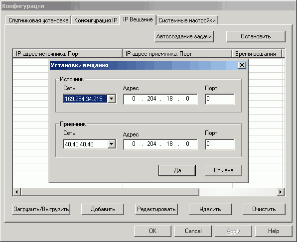 Раздел Конфигурация IP посвящён настройке тюнера при использовании его в качестве модема. Ещё одна оригинальная особенность — как правило, для этой цели используется отдельная программа, а не соответствующий режим основной. Достоинствами такого подхода можно назвать отсутствие конфликтов между разными модулями и быстрое переключение между режимами. Отмеченное в обзоре Nextorm NCS120 в качестве недостатка отсутствие возможности запуска программы в режиме приёма данных ушло в прошлое. Ключ «- h» позволяет не только запустить программу именно в таком виде, но и свернуть её в системный трей (кстати, именно в таком виде программа прописывается в автозагрузке после установки).