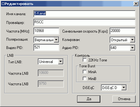 Поддерживается список пользовательских каналов, добавления произвольного канала и редактирование параметров вплоть до настроек DiSEqC.