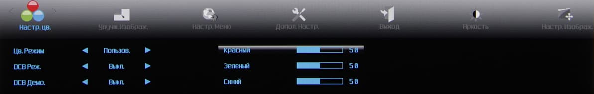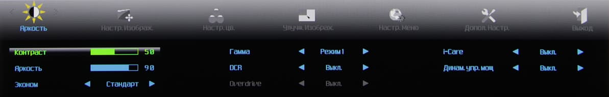 а при долгом нажатии запускает автоматическую подстройку под параметры VGA-сигнала, вторая — переключает режимы Эконом, третья отвечает за регулировку громкости, четвертая — выводит меню установок. Меню представляет собой широкую полосу со значками страниц в верхней части и с настройками в нижней. Навигация по меню не самая удобная, но привыкнуть можно. При настройке изображения меню остается на экране, что немного мешает оценке вносимых изменений. Можно передвинуть меню, отрегулировать прозрачность его фона и установить тайм-аут автоматического выхода из меню. Есть русская версия экранного меню.