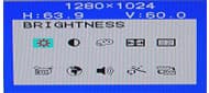А пока заглянем в меню: оно полностью графическое и состоит из двух строк иконок, за каждой из которых закреплена или единичная настройка параметра (типа яркости) или подменю (вроде регулировки fase/clock). В принципе наглядно и понятно, но мы бы предпочли классическую вертикальную чисто текстовую форму без графических изысков.