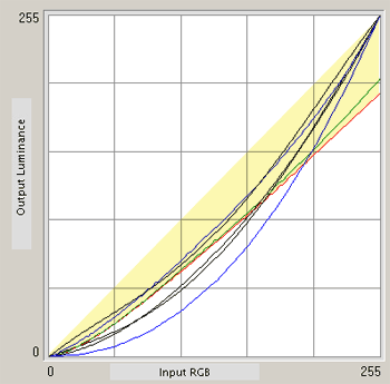 С одной стороны, каналы ведут себя более строго и «ложатся кучно». С другой, явный избыток яркости с пиком искажения на средних полутонах только увеличился. Формально говоря такая картина никуда не годится и строго требует калибратора. Причем даже в бОльшей степени, чем раньше.