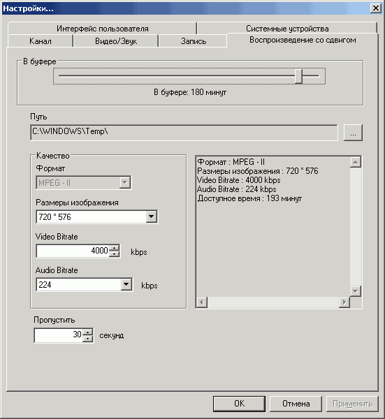 Настройки параметров отложенного просмотра Timeshift (сжатие в MPEG2 осуществляется силами CX23417) допускают выбор разрешения, аудио- и видеобитрейта, максимальное время буфера, исходя из доступного места на жёстком диске, и интервал пропуска при перемотке.