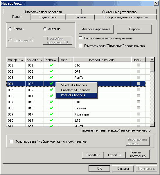К сортировке каналов при помощи перетаскивания их с зажатой левой кнопкой мыши и недавно появившейся возможности их группировки (Pack all Channels в контекстном меню, вызываемом правой кнопкой) добавились импорт и экспорт каналов в файл.