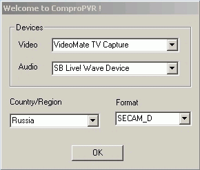 При первом запуске ComproPVR выбираем страну, стандарт телевещания, аудио- и видеоустройства