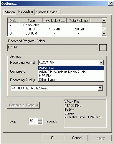 Выбирать можно из *.wav, *.wma, *.mp3 - джентльменский набор. Несколько смущает загадочный Other Type — видимо, задел на будущее :-) .