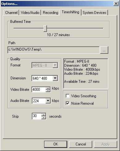 На закладке Timeshifting можно настроить разрешение, видео- и аудиобитрейт, размер буфера и задействовать функции Noise Removal и Video Smoothing