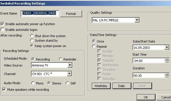А вот включением компьютера для записи (описанная выше Compro POWER UP SCHEDULING) мне, к сожалению, насладиться не удалось. Возможной причиной этого является то, что наш образец рассчитан на работу с системными платами, при старте выдающими напряжение 5V, а затем понижающими его до 0, а у небольшого количества плат на рынке все происходит с точностью до наоборот. В следующих ревизиях, как мне сообщили, это несовместимость уже устранена. Впрочем, возможна и банальная неисправность или повреждение при транспортировке. Не скажу, что меня это особо расстроило, потому что из режима Hibernate планировщик выводил компьютер исправно.