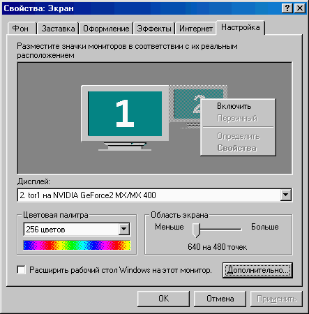 Режим »Extend» включается прямо на первой закладке »Свойства: Экран»