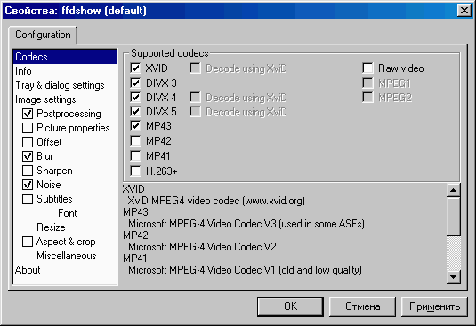 Указание кодеков, поддерживаемых видеофильтром FFDShow.