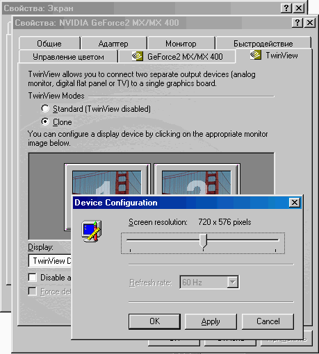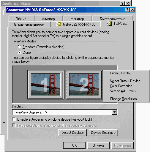 Для просмотра разных изображений на мониторе и телевизоре благодаря технологии TwinView (nView) у видеокарт GeForce2MX/4MX/4ti можно с успехом использовать режим Clone, главное при этом — правильно настроить драйвер.